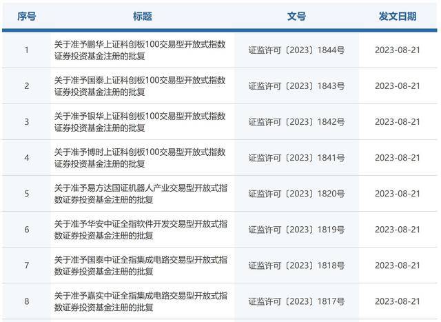 证监会官网信息显示,首批申报的4只科创100ETF、沪深交易所《指数基金开发指引》修订后首批适用新标准的4只非宽基ETF产品,已于8月21日获批。4只科创100ETF分别为:银华上证科创板100 ETF、鹏华上证科创板100 ETF、国泰上证科创板100ETF、博时上证科创板100ETF。沪深交易所《指数基金开发指引》修订后首批适用新标准的4只非宽基ETF产品有:易方达国证机器人产业ETF、华安中证全指软件开发ETF、国泰中证全指集成电路ETF和嘉实中证全指集成电路ETF。