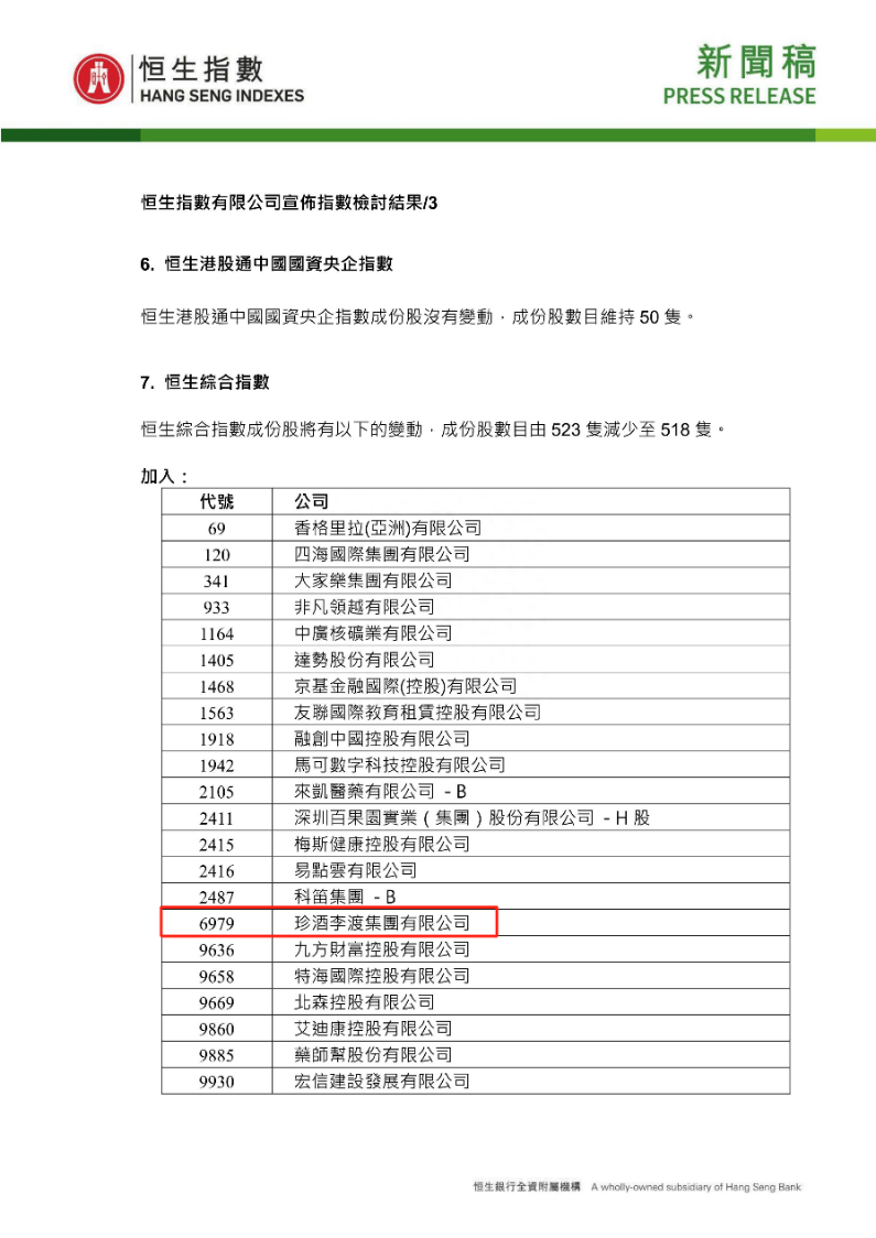 恒生公布指数检讨结果 珍酒李渡纳入港股通