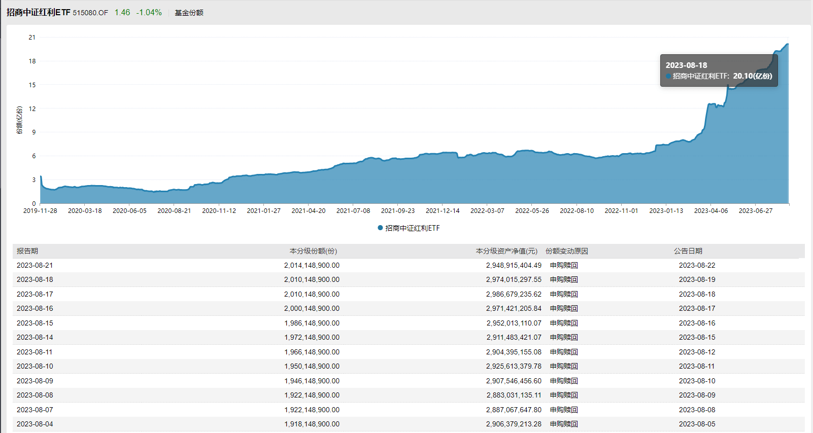 8月22日,两市平盘震荡。截至10时12分,中证红利ETF(515080)微跌0.07%,一度涨0.61%,今年以来累计涨8.16%,成分股威孚高科、天健集团、长江传媒、海螺水泥、凤凰传媒、中国太保涨幅居前。资金热度不减,该基金年内份额扩容约174.35%,最新份额超20亿份,迭创历史新高。
