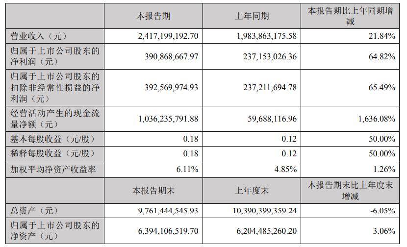 2023年半年度公司实现营业收入24.17亿元,同比增长21.84%;实现归属于上市公司股东净利润3.91亿元,同比增长64.82%,归属于上市公司股东的扣除非经常性损益的净利润3.93亿元,同比增长65.49%。