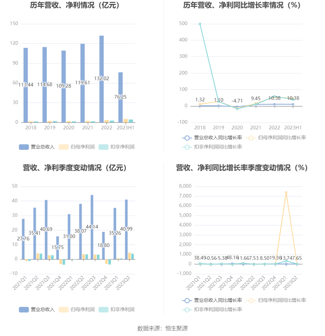 根据半年报,公司第二季度实现营业总收入40.99亿元,同比增长7.65%,环比增长16.23%;归母净利润4.49亿元,同比增长28.47%,环比增长595.95%;扣非净利润3.82亿元,同比增长13.06%,环比增长575.49%。
