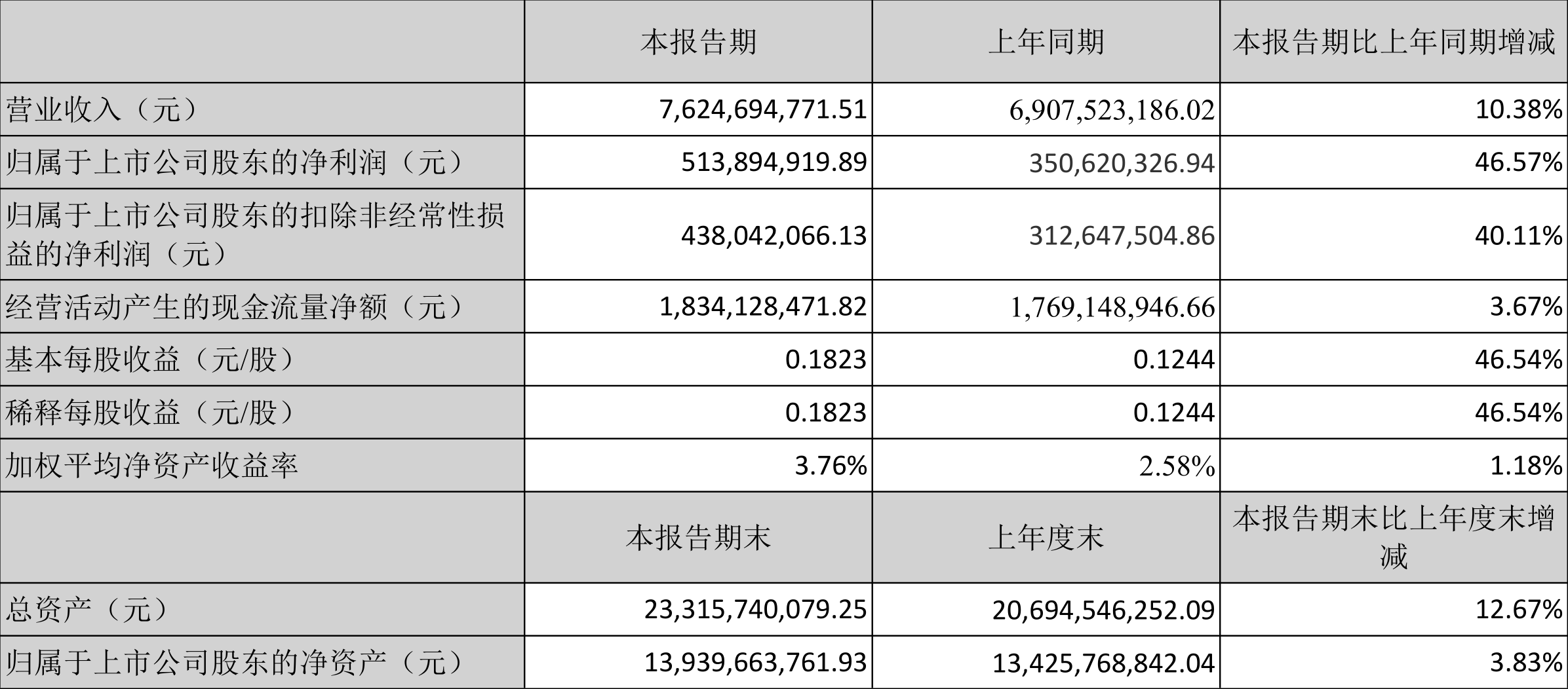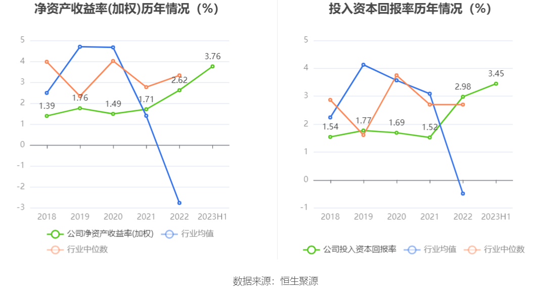 数据显示,2023年上半年公司加权平均净资产收益率为3.76%,较上年同期增长1.18个百分点;公司2023年上半年投入资本回报率为3.45%,较上年同期增长1.04个百分点。