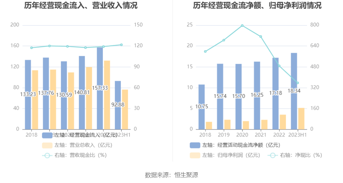 2023年上半年,公司营业收入现金比为121.81%,净现比为356.91%。
