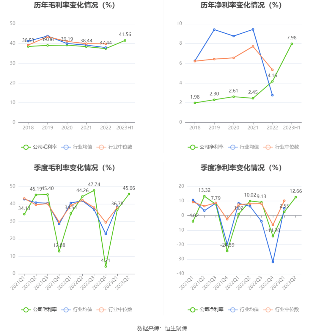 2023年上半年,公司毛利率为41.56%,同比上升1.66个百分点;净利率为7.98%,较上年同期上升2.00个百分点。从单季度指标来看,2023年第二季度公司毛利率为45.66%,同比上升1.40个百分点,环比上升8.88个百分点;净利率为12.66%,较上年同期上升2.64个百分点,较上一季度上升10.11个百分点。
