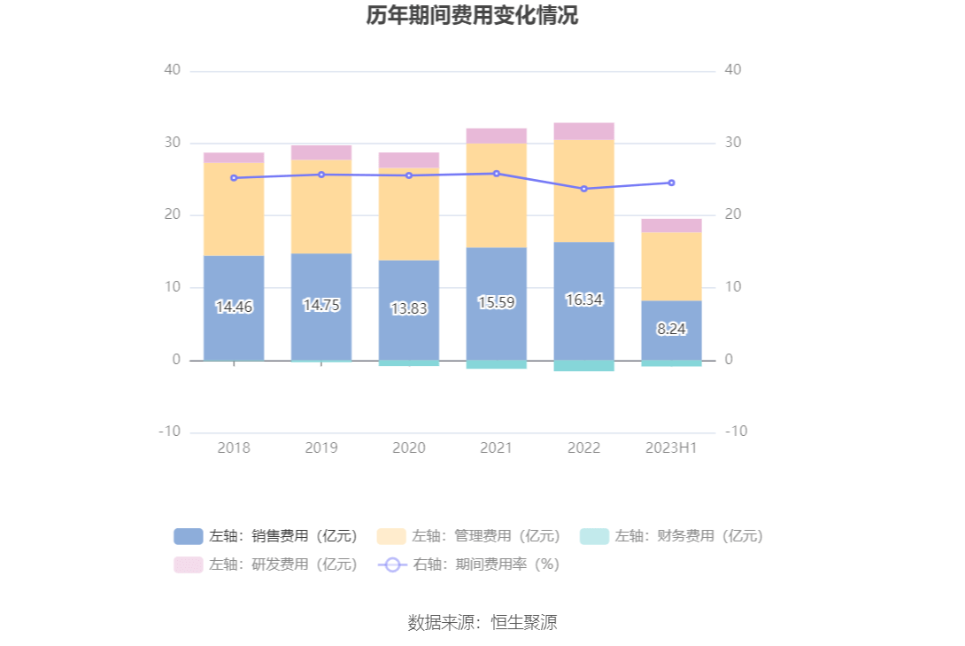 2023年上半年,公司期间费用为18.71亿元,较上年同期增加1.51亿元;但期间费用率为24.53%,较上年同期下降0.37个百分点。其中,销售费用同比增长4.11%,管理费用同比增长14.02%,研发费用同比增长9.89%,财务费用由去年同期的-7097.86万元变为-8558.43万元。