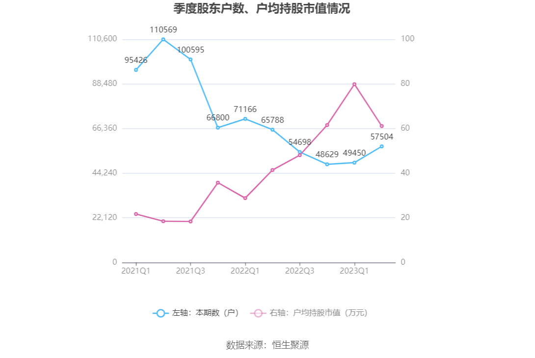 筹码集中度方面,截至2023年二季度末,公司股东总户数为5.75万户,较一季度末增长了8054户,增幅16.29%;户均持股市值由一季度末的79.85万元下降至61.12万元,降幅为23.46%。