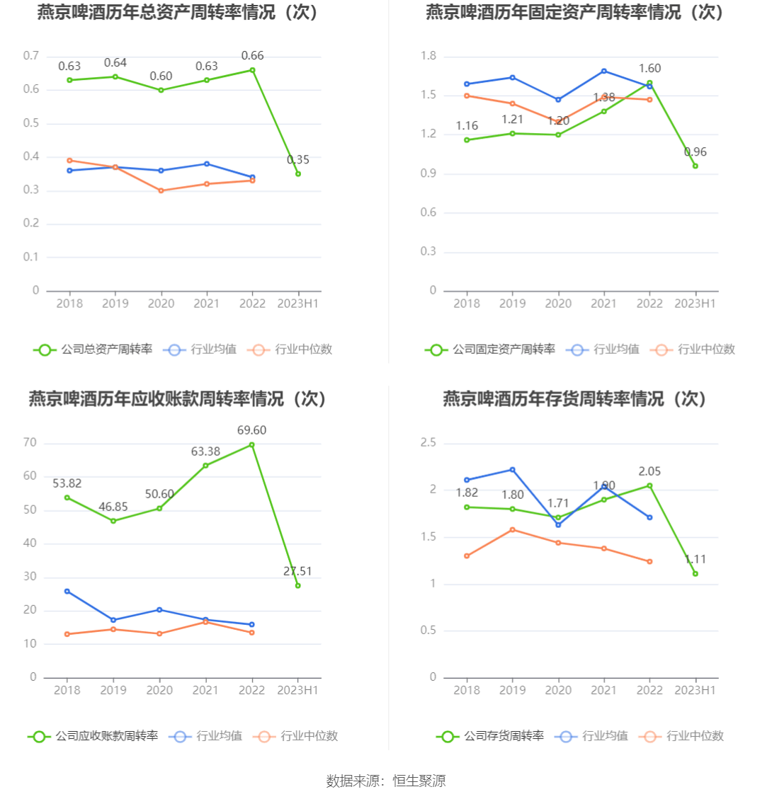 营运能力方面,2023年上半年,公司总资产周转率为0.35次,上年同期为0.34次(2022年上半年行业平均值为0.16次,公司位居同行业3/16);固定资产周转率为0.96次,上年同期为0.83次(2022年上半年行业平均值为0.76次,公司位居同行业7/16);公司应收账款周转率、存货周转率分别为27.51次、1.11次。