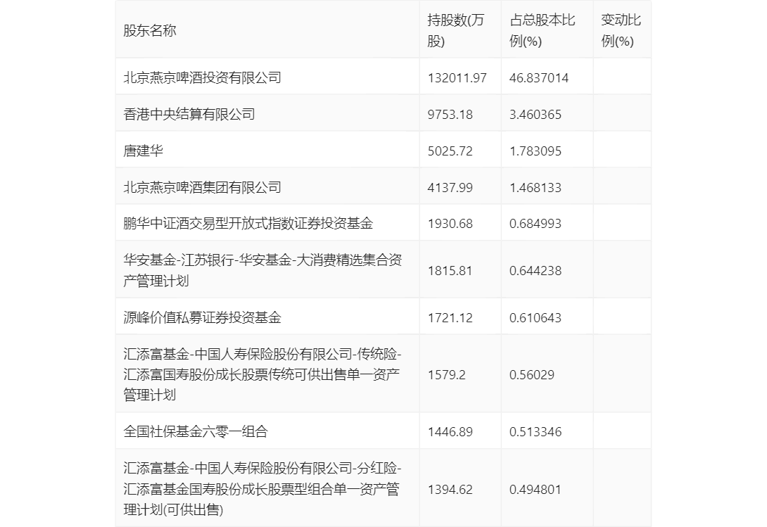 半年报显示,2023年上半年末的公司十大流通股东中,新进股东为华安基金-江苏银行-华安基金-大消费精选集合资产管理计划、汇添富基金-中国人寿保险股份有限公司-传统险-汇添富国寿股份成长股票传统可供出售单一资产管理计划、全国社保基金六零一组合、汇添富基金-中国人寿保险股份有限公司-分红险-汇添富基金国寿股份成长股票型组合单一资产管理计划(可供出售)。在具体持股比例上,鹏华中证酒交易型开放式指数证券投资基金持股有所上升,香港中央结算有限公司、源峰价值私募证券投资基金持股有所下降。