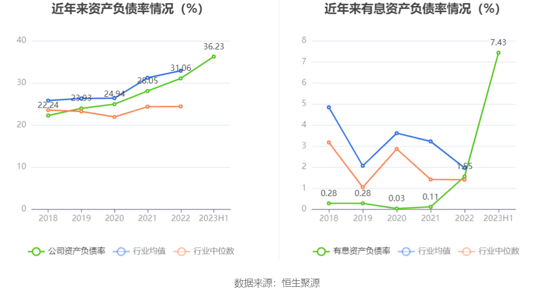 偿债能力方面,公司2023年二季度末资产负债率为36.23%,相比上年末增加5.17个百分点;有息资产负债率为7.43%,相比上年末增加5.88个百分点。