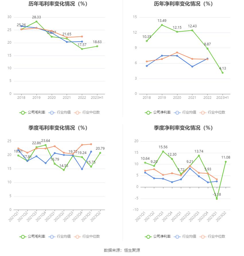 2023年上半年,公司毛利率为18.63%,同比上升3.12个百分点;净利率为4.13%,较上年同期下降3.59个百分点。从单季度指标来看,2023年第二季度公司毛利率为20.79%,同比上升6.24个百分点,环比上升5.04个百分点;净利率为11.08%,较上年同期上升1.87个百分点,较上一季度上升16.26个百分点。