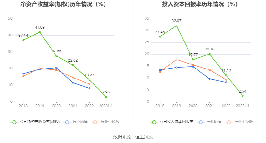 数据显示,2023年上半年公司加权平均净资产收益率为2.95%,较上年同期下降3.22个百分点;公司2023年上半年投入资本回报率为2.54%,较上年同期下降3.11个百分点。
