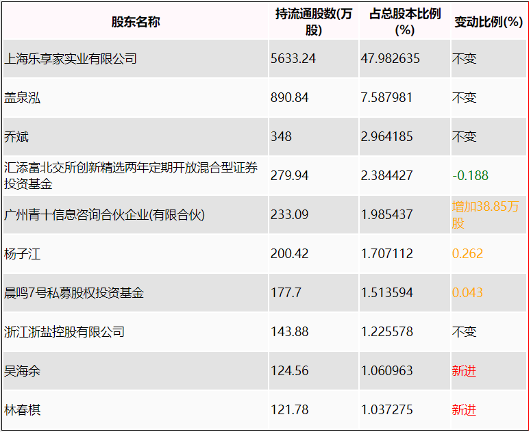 半年报显示,2023年上半年末的公司十大股东中,新进股东为吴海余、林春棋,取代了一季度末的南方北交所精选两年定期开放混合型发起式证券投资基金、开源守正5号集合资产管理计划。在具体持股比例上,广州青十信息咨询合伙企业(有限合伙)、杨子江、晨鸣7号私募股权投资基金持股有所上升,汇添富北交所创新精选两年定期开放混合型证券投资基金持股有所下降。