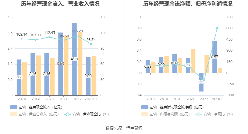 2023年上半年,公司营业收入现金比为98.74%,净现比为608.25%。