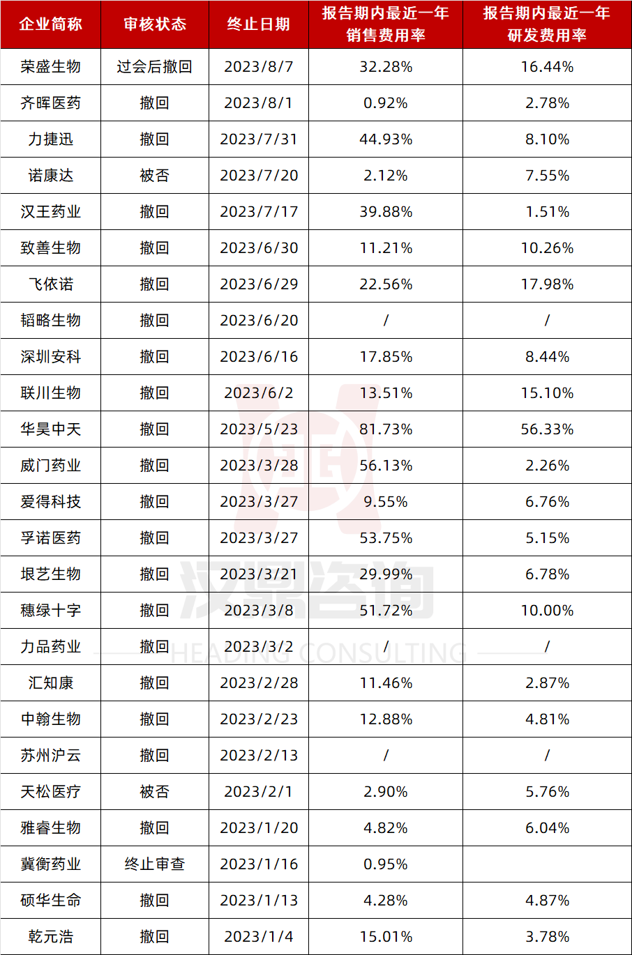 截至8月21日,今年已有25家医药企业IPO终止,剔除3家报告期内尚未形成收入或销售推广费企业外,其余22家报告期内最近一年平均销售费用率达23.66%,4家企业销售费用超50%,而仅有1家企业报告期内最近一年研发费用率超50%。