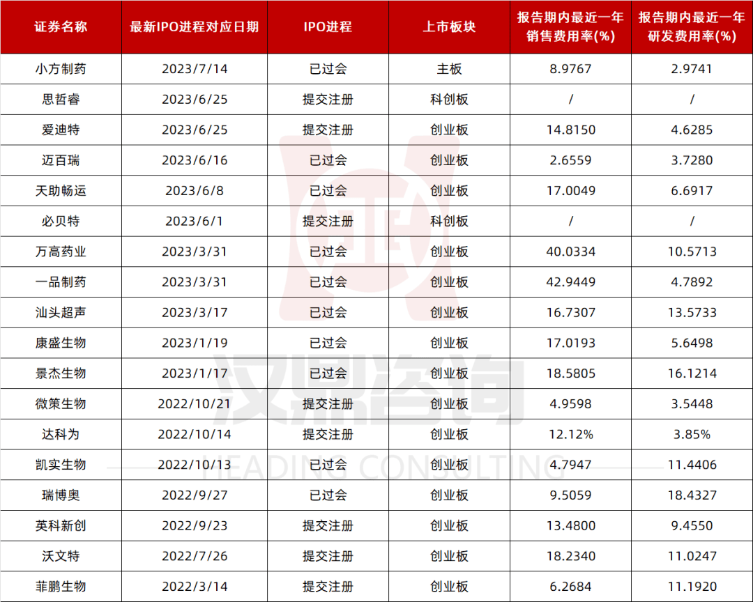 另据iFind显示,截至8月21日,A股2022年后IPO申报被受理且已更新2022年度财务数据的拟上市生物医药企业还有38家,平均销售费用率为39.03%,8家企业销售费用率超40%,其中2家超50%。其中多家医药IPO项目将销售费用率与上市药企对比,以证明自身的销售费用率具备合理性,但部分项目的可比对象的销售费用问题已被有关部门点名或存在贿赂风险。如申报创业板企业科瑞德2022年销售费用率为48.03%,为证明销售费用率的合理性,公司将西点药业(301130.SZ)等上市药企作为可比公司,但西点药业的名字曾出现在监管点名存在贿赂风险的名单中。