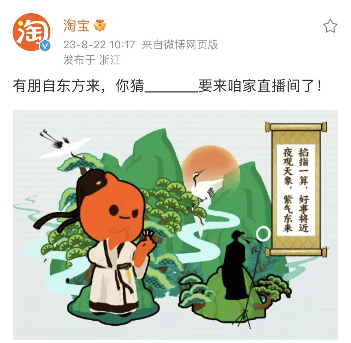 只见淘公仔穿着仙气飘飘的古装,海报上写着:“掐指一算,好事将近;夜观天象,紫气东来。”图上还有一个古装剪影,似乎暗指东方甄选。