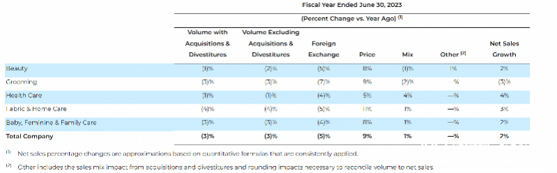 财报显示,2023财年,宝洁旗下五大业务板块产品全线涨价,涨幅平均为9%,其中,织物和家庭护理板块涨幅最高,为11%。产品销量同比下降3%,但净销售额增长7%。