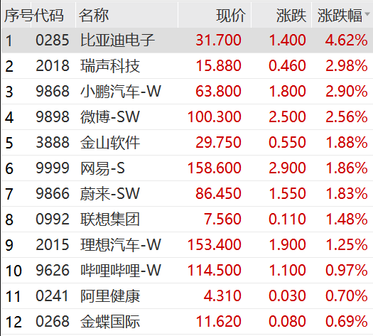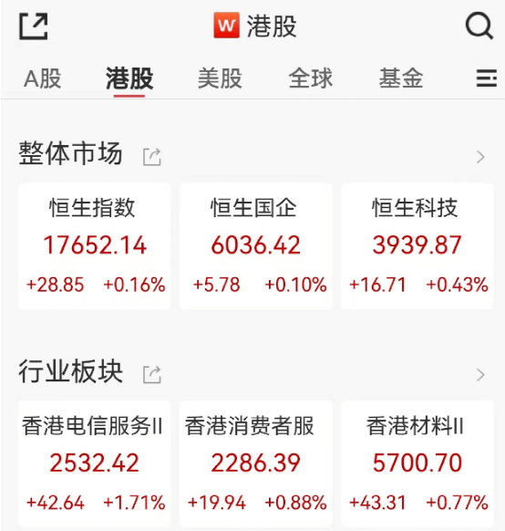 港股市场上午高开震荡,截至午间收盘涨幅已明显收窄:恒生指数涨0.16%,恒生科技涨0.43%。电信、银行、多元金融涨幅居前,比亚迪电子涨4.62%。