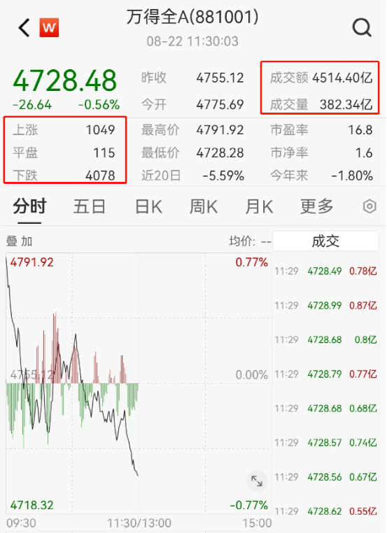 半日市场成交4514.4亿元,北向资金净流出43.1亿元。超4000只个股飘绿,115只平盘,仅1049只飘红。