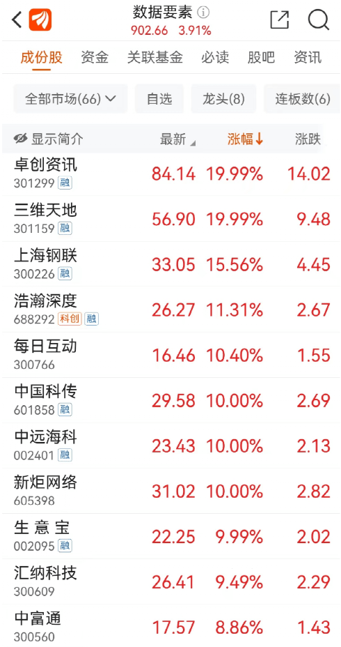 个股方面,卓创资讯、三维天地“20cm”涨停,上海钢联、浩瀚深度、每日互动涨超10%,中国科传、中远海科、新炬网络、生意宝等多股涨停。