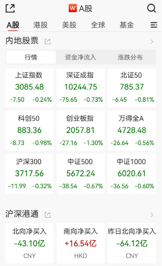 首先来看大A股的整体情况:上午市场高开低走,截至午间收盘,上证指数跌0.24%,深证成指跌0.73%,创业板指跌1.3%。