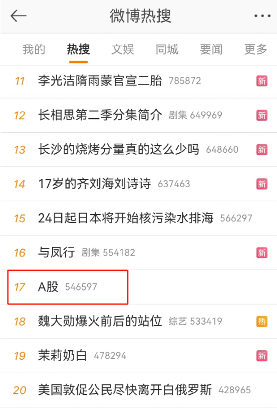 以及,上午A股又一次登上了微博热搜。