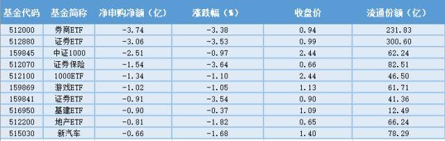 资金流出方面,21日净赎回金额最多的是券商ETF(512000),赎回金额3.74亿元。赎回金额超过1亿元的还有证券ETF(512880)、中证1000(159845)、证券保险(512070)、1000ETF(512100)、游戏ETF(159869),赎回金额分别为3.06亿元、2.51亿元、1.54亿元、1.34亿元、1.02亿元。
