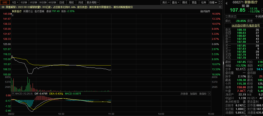 国产影像设备龙头联影医疗今日跌破发行价,截至午间收盘,该股跌13.72%至107.85元,盘中股价一度跌超15%至105元,而其发行价为109.88元/股。公司最新市值888.9亿元,上市以来首次跌出千亿俱乐部。