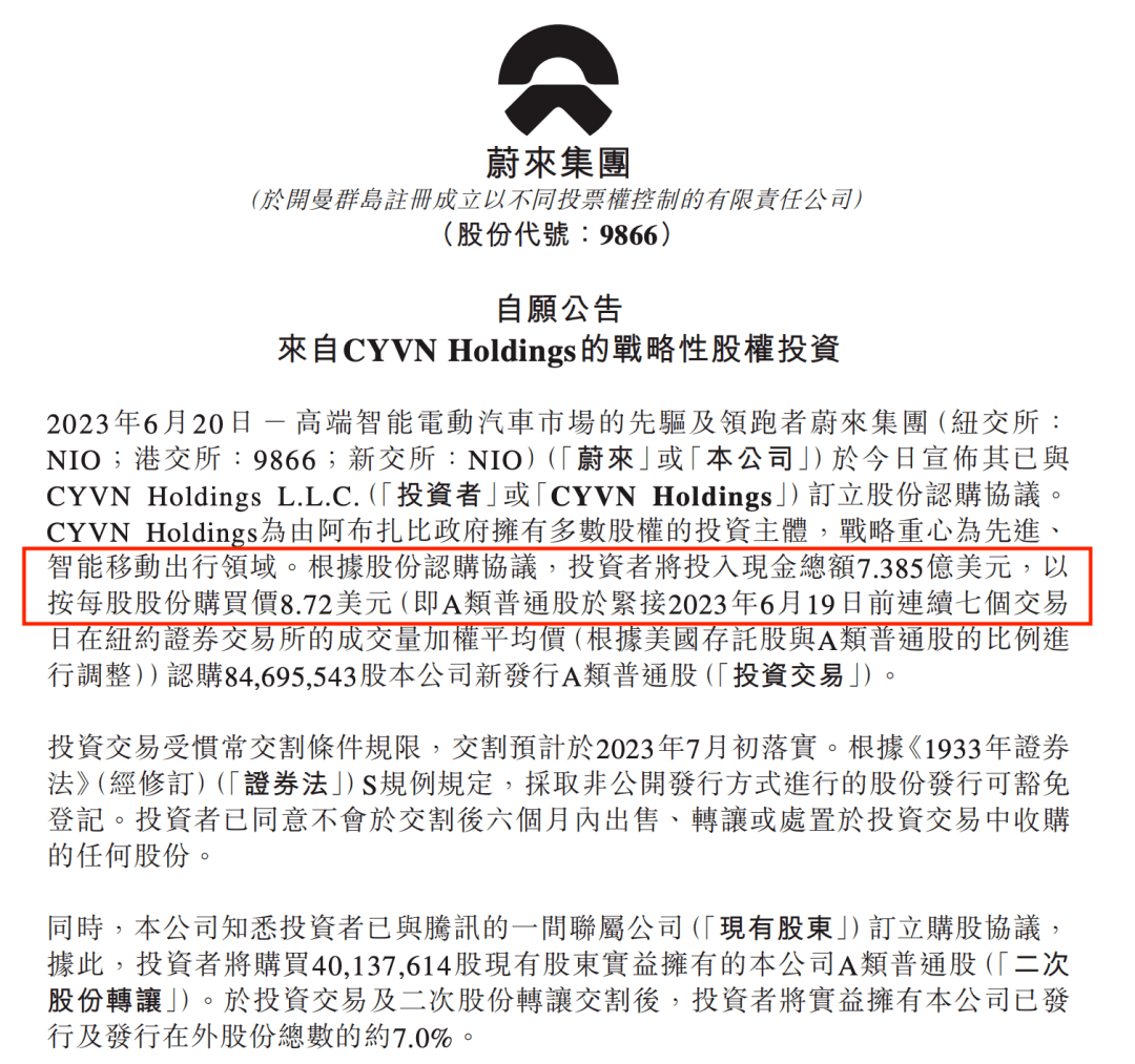 表现之二是资本市场眷顾。6月下旬,蔚来官方宣布,阿布扎比投资机构CYVNHoldings已与蔚来达成股份认购协议,为蔚来投资了11亿美元(约80亿元人民币)。这一举动被行业视为“雪中送炭”。