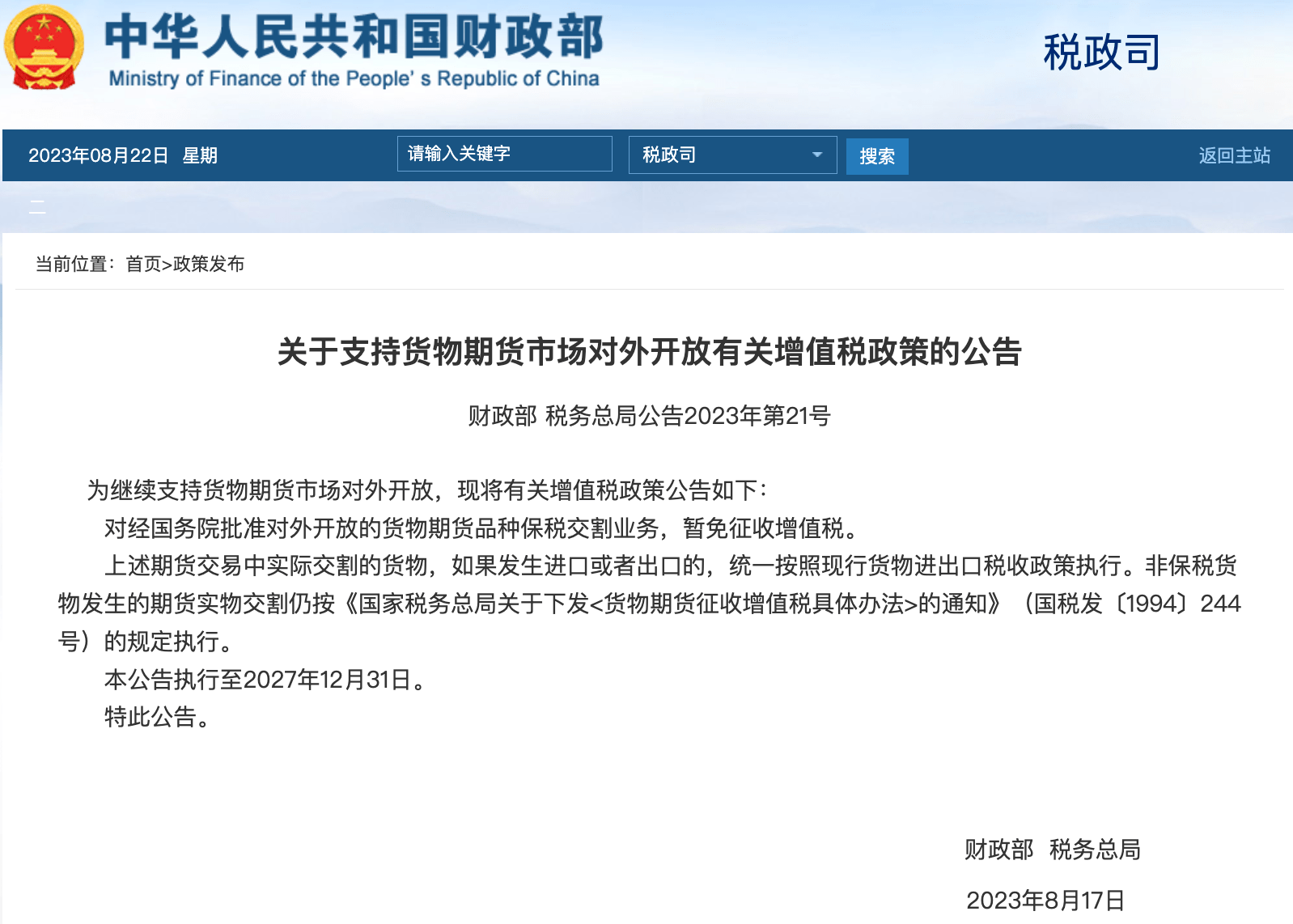 经济观察网讯据财政部网站8月22日消息,近日,财政部、税务总局发布《关于支持货物期货市场对外开放有关增值税政策的公告》,对经国务院批准对外开放的货物期货品种保税交割业务,暂免征收增值税。