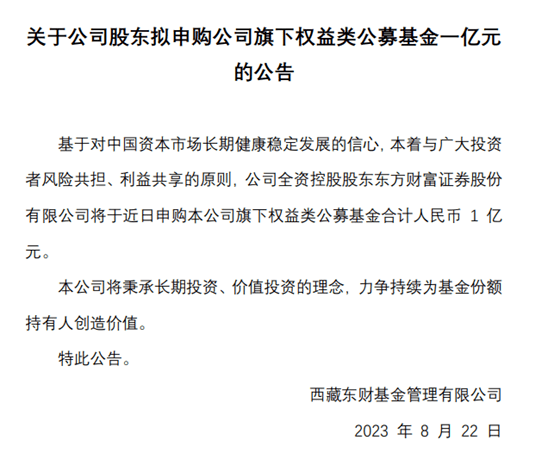 比如,东财基金今天发布关于公司股东拟申购公司旗下权益类公募基金1亿元的公告。公告称,基于对中国资本市场长期健康稳定发展的信心,本着与广大投资者风险共担、利益共享的原则,公司全资控股股东东方财富证券股份有限公司将于近日申购公司旗下权益类公募基金合计人民币1亿元。