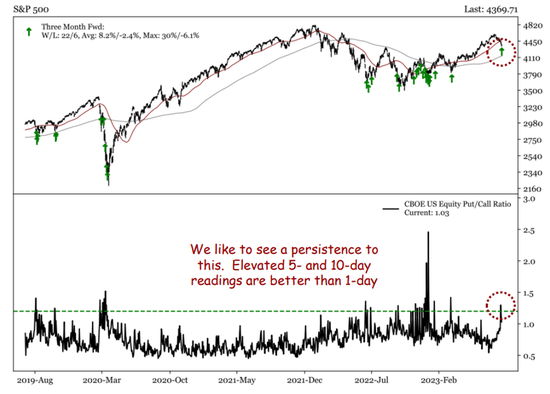 此外,Krinsky和deGraaf还都引用了美股10日看跌/看涨期权比率,该比率最近飙升至2023年的最高水平,因交易员纷纷买入看跌期权,以在股价下跌时获得回报。