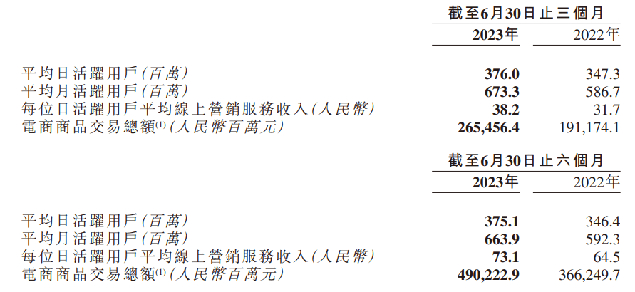 2023 年第二季度,快手应用的平均日活跃用户及月活跃用户达 3.76 亿及 6.733 亿,分别同比增长 8.3% 及 14.8%,用户社区规模达历史新高。2023 年第二季度,快手应用的每位日活跃用户日均使用时长为 117.2 分钟。得益于日活跃用户的快速增长,快手应用的用户总时长继续实现同比增长。