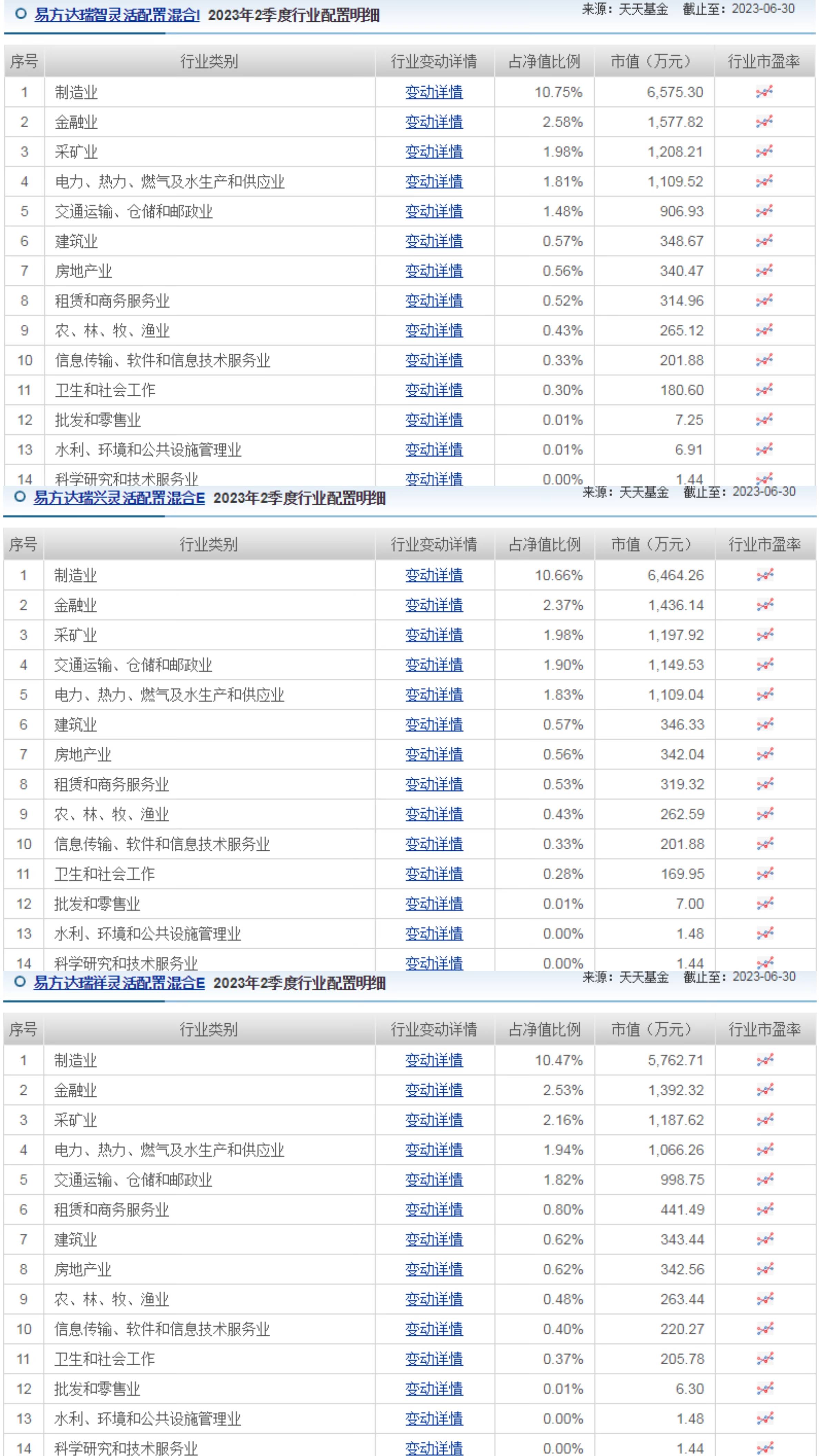 例如,2023年二季度,易方达裕鑫债券A和易方达裕富债券A都是混合债券型基金(二级),偏好配置制造业,占比均在15%左右,且均配置了金融业、IT、交通等板块;易方达瑞智I、易方达瑞祥E和易方达瑞兴E的相似度更高,都是灵活配置型基金,14个行业类别全部相同,均配置了10.5%左右的制造业、2.5%左右的金融业及2%左右的采矿业。
