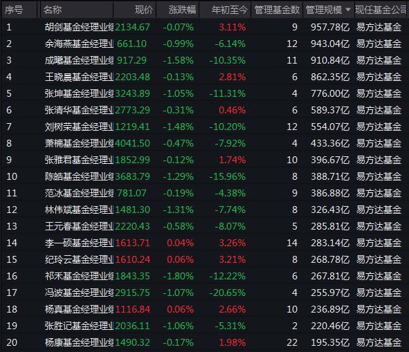 不过,杨康虽然在管基金总数最多,但规模并非最大,截至今年二季度末总规模为195.35亿元。据Wind数据,在管规模在500亿以上的易方达基金经理就有7位,排在首位的是管理规模957.78亿的“固收+”老将胡剑,“顶流”张坤以776亿的管理规模排在第5,57位基金经理中杨康排在第20名。