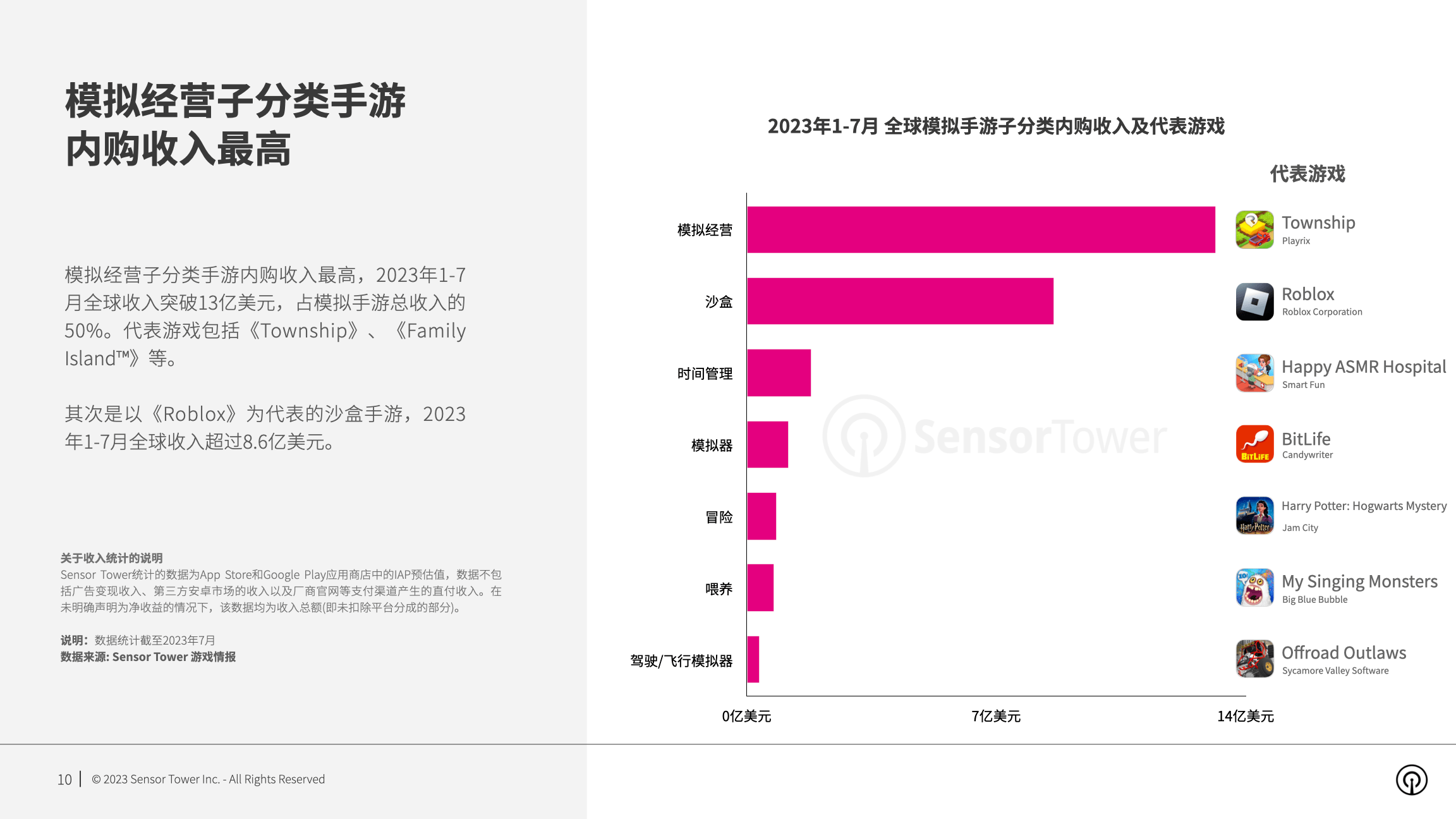 在模拟手游子分类中,模拟经营游戏内购收入最高,2023年1-7月全球收入突破13亿美元,占模拟手游总收入的近50%。代表游戏包括《Township》、《Family Island》等。
