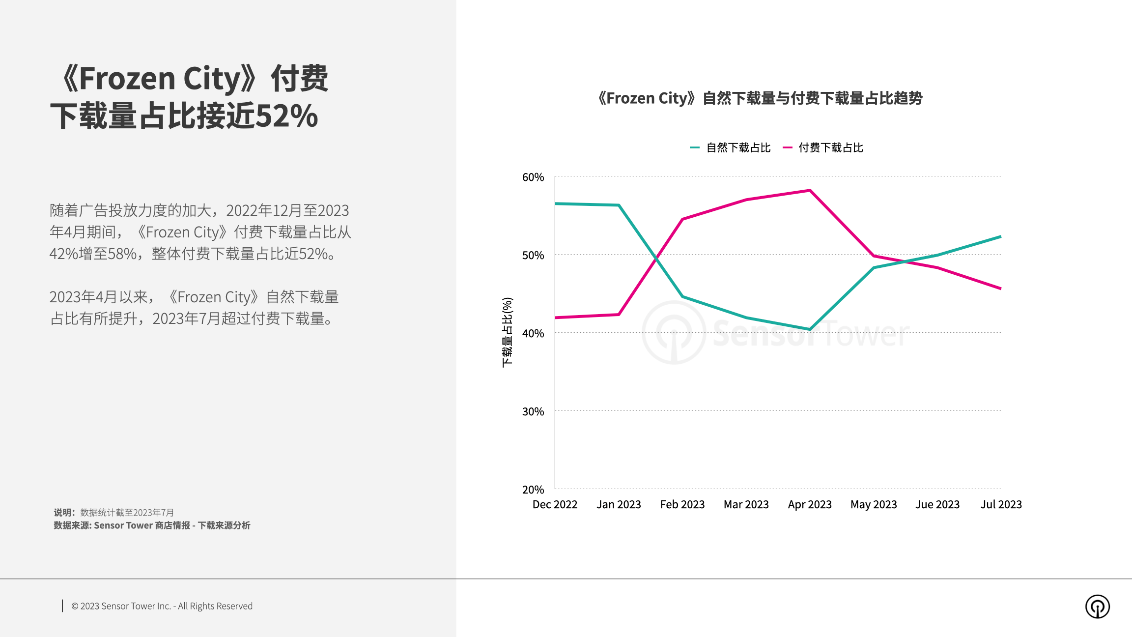 随着广告投放力度的加大,2022年12月至2023年4月期间,《Frozen City》付费下载量占比从42%增至58%,整体付费下载量占比近52%。