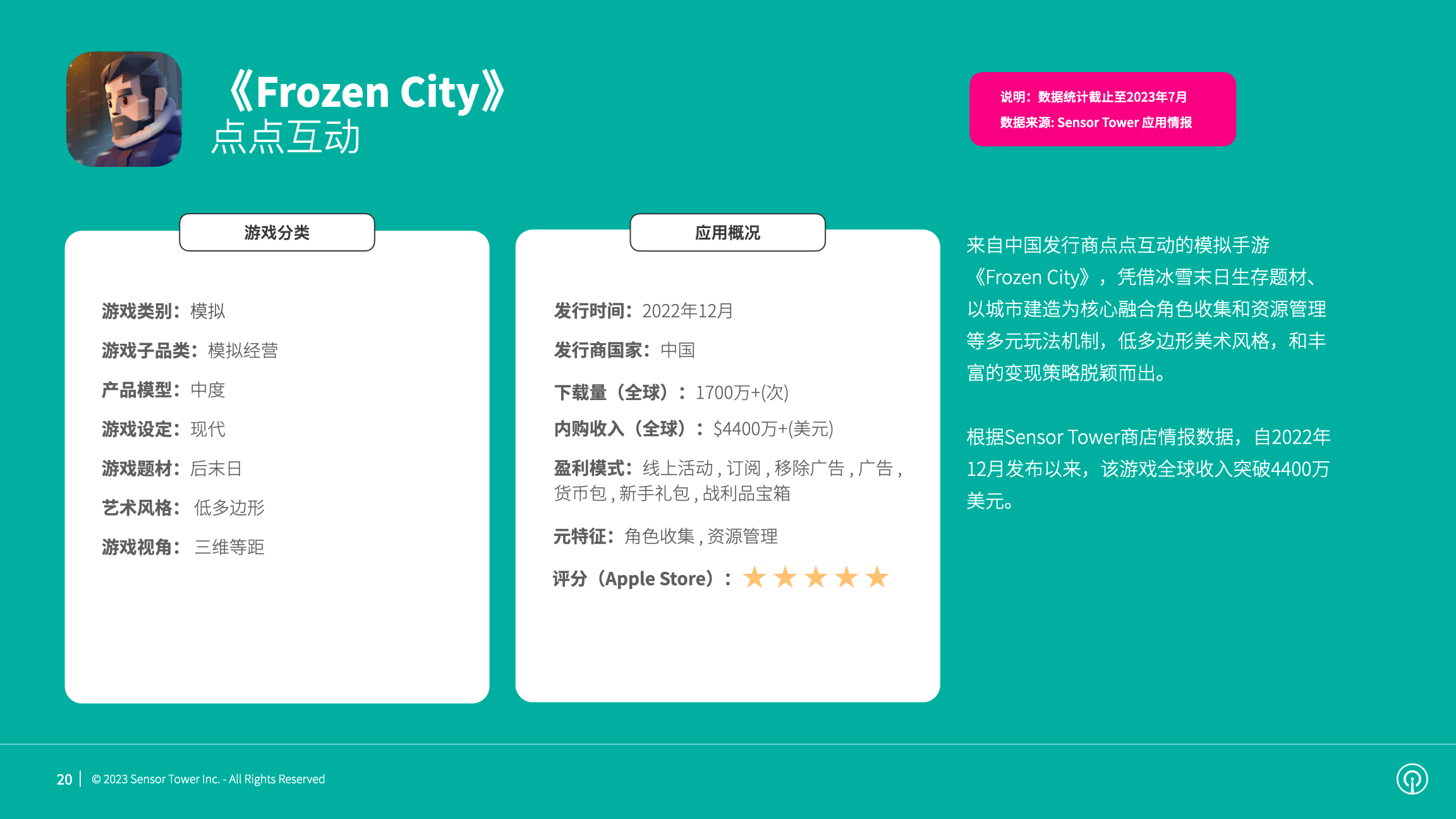 冒险沙盒手游《Roblox》2023年1-7月全球吸金逼近7亿美元,蝉联模拟手游收入榜冠军。点点互动的两款模拟手游《Family Farm Adventure》、《Frozen City》均入围收入榜Top10。