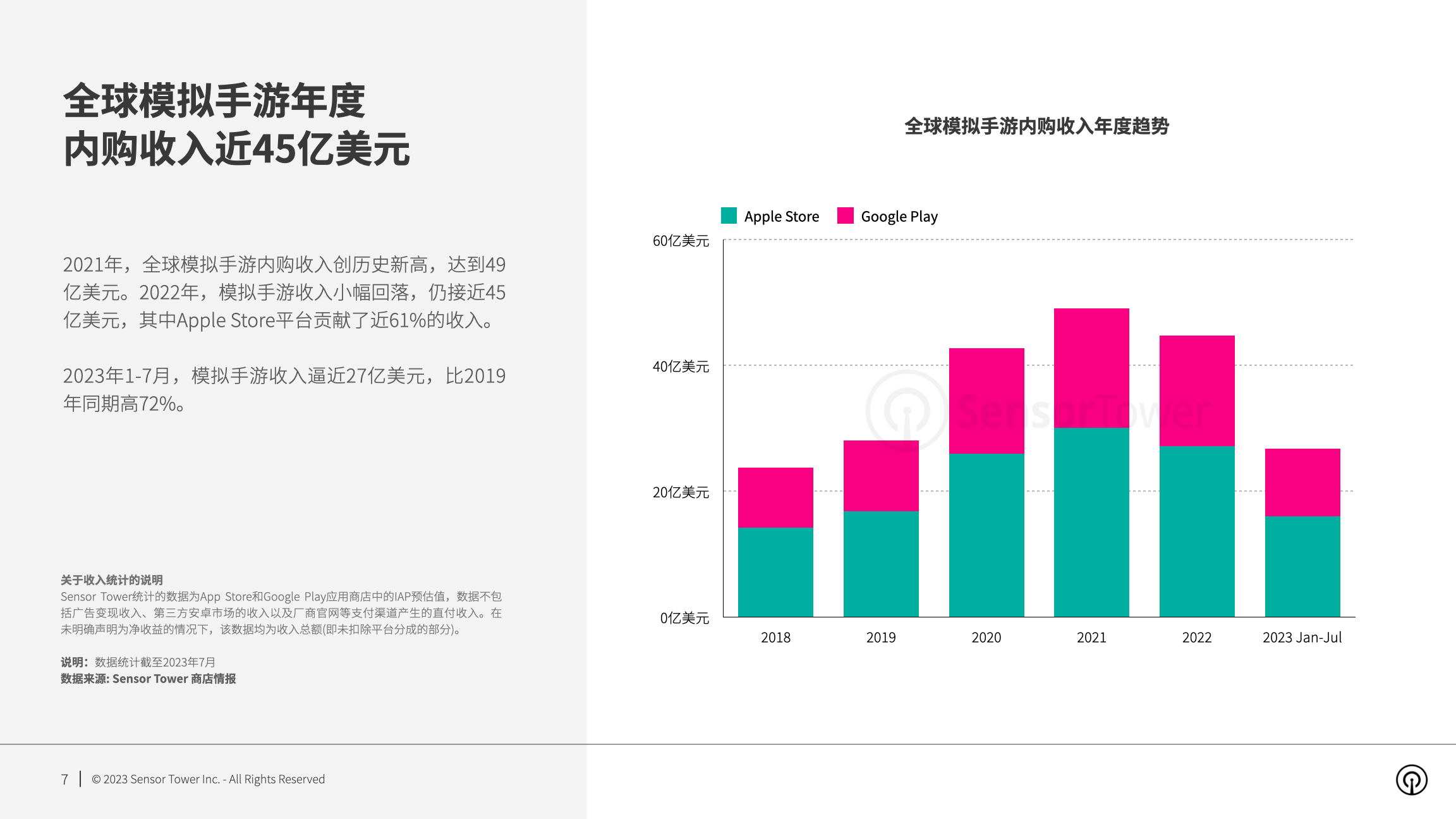 2021年,全球模拟手游内购收入创历史新高,达到49亿美元。2022年,模拟手游收入小幅回落,仍接近45亿美元。2023年1-7月,模拟手游收入逼近27亿美元,比2019年同期高72%。