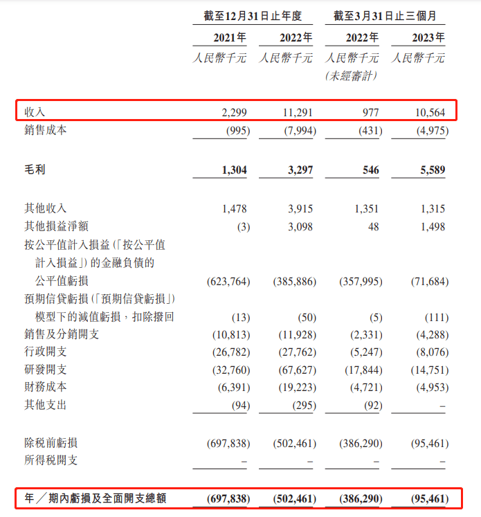 据招股书,脑动极光收入从2021年的229.9万元增长至2022年的1129.1万元,2023年一季度该公司营收为1056.4万元仅略低于去年全年收入,但与亏损金额相比,该公司的收入仍显得“微不足道”。仅2023年一季度,该公司亏损金额就达9546.1万元,较去年同期的3.86亿元亏损额有所收窄,但绝对值仍处于高位。