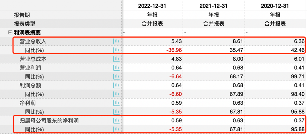 2020年-2022年,深演智能的营业总收入分别为6.36亿元、8.61亿元和5.43亿元,同比增长率分别为42.46%、35.47%和-36.96%;同期归母净利润分别为0.37亿元、0.63亿元和0.59亿元,同比增长率分别为95.88%、67.81%和-5.35%。