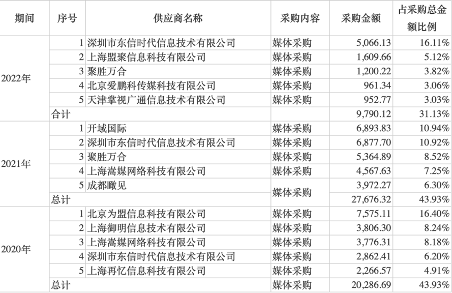 到2022年时依然如此,2021年中的五名供应商中仅有深圳市东信时代信息技术有限公司及聚胜万合仍为前五大供应商,新增上海盟聚信息科技有限公司、北京爱鹏科传媒科技有限公司、天津掌视广通信息技术有限公司三名供应商。