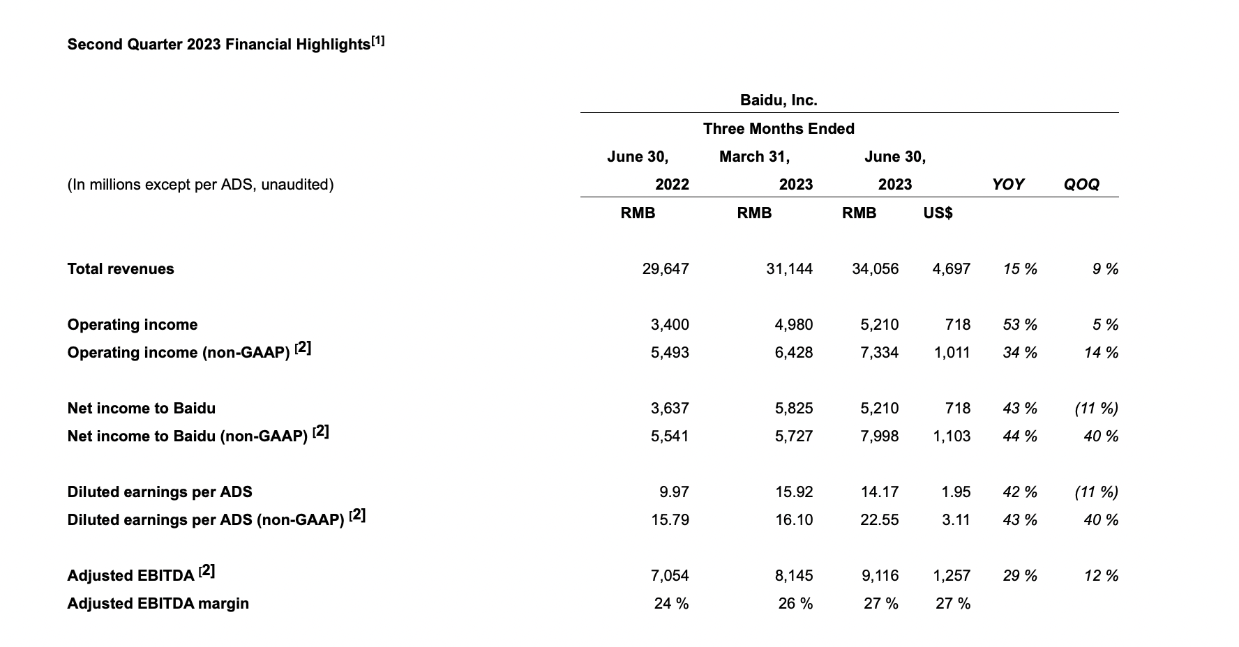 北京时间8月22日,百度(NASDAQ:BIDU,HKEX: 9888)发布了截至2023年6月30日的第二季度未经审计的财务报告。第二季度,百度实现营收341亿元,同比增长15%;非美国通用会计准则(non-GAAP)归属百度的净利润达到80亿元,同比增长44%;营收和利润均大幅增长,超市场预期。此前分析师预估非公认会计准则下,百度每股美国存托股稀释收益为16.81元,数据显示二季度收益为22.55元。