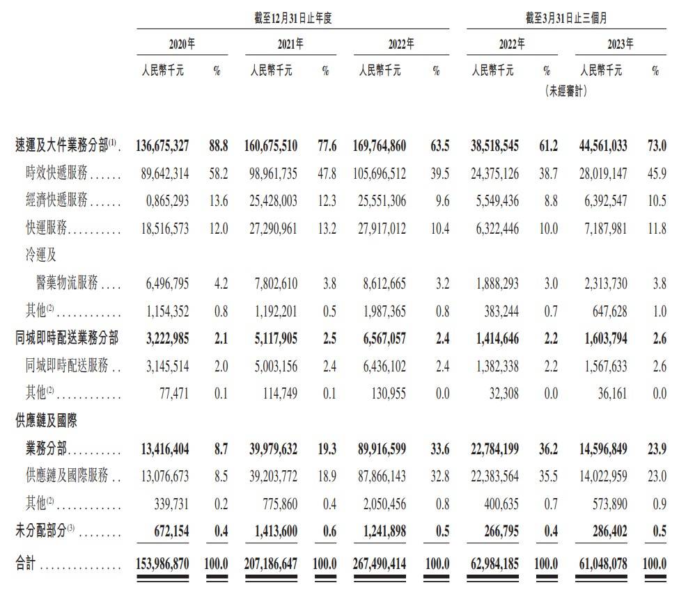 如上图招股书数据显示,顺丰控股的营收大头:速运及大件业务分部,这两年增速似乎有放缓趋势,2021年该分部营收同比增速约17.55%,到2022年降至5.7%。2023年1季度该增速为15.7%。
