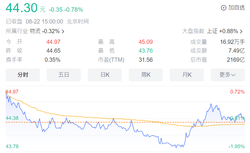 截至今日收盘,顺丰控股A股微跌0.78%,每股价格报收44.3元。