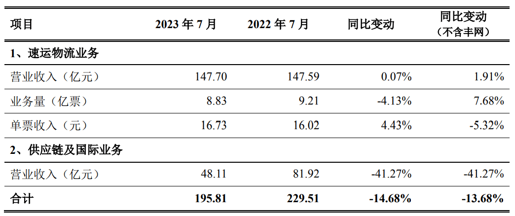 根据前两天顺丰控股披露的2023年7月快递物流业务经营简报,该司7月速运物流业务营收147.7亿元,同比增长0.07%;供应链及国际业务营收48.11亿元,同比下滑41.27%。