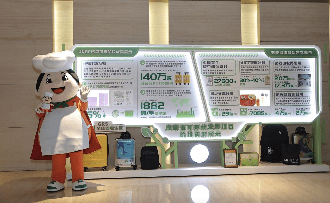 (康师傅可持续发展项目阶段成果展示)作为行业龙头,康师傅积极联动合作伙伴共创先进生态,让可持续发展理念在产业链及消费市场开花结果。今年4月,康师傅与国内头部拉杆箱品牌等合作伙伴,经过专利技术处理后共同推出的环保旅行箱,在电商全渠道上架后,很快成为店铺销冠商品。据上述负责人介绍,1个20寸的旅行箱大约可消耗47个康师傅冰红茶500ml空瓶,为PET废弃物找到循环利用的又一有效途径。这也是康师傅推出的第一个商业化rPET(回收的聚对苯二甲酸乙二醇酯)项目,探索与广大消费者“踏绿而行”。“公司倡导绿色消费,并乐于与业界分享自身在食品安全和可持续发展的前瞻研究和技术优势。”康师傅方面表示,目前公司已设立以2017年为基准,到2025年每百万元收益综合能源消耗下降12%、取水量下降8%、温室气体排放下降18%,生产型原料废弃物回收率不低于97%的阶段性目标。