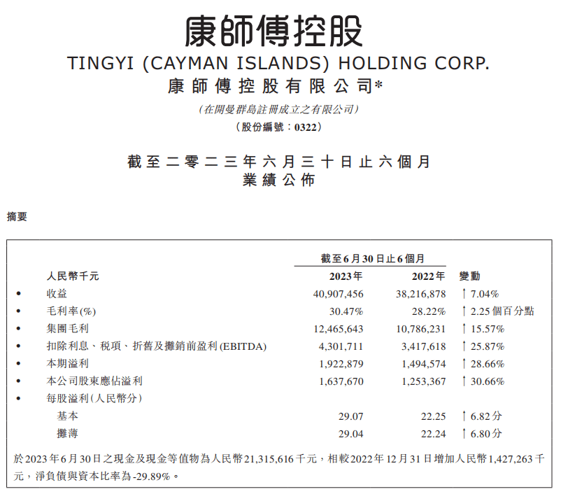 上证报中国证券网讯 8月22日,港股上市公司康师傅控股公布的截至2023年6月30日止6个月的业绩报告显示,报告期内,集团(康师傅控股有限公司及其附属公司)收益为409.07亿元人民币,较2022年同期增长7.04%;毛利率为30.47%,同比提高2.25个百分点;公司股东应占溢利为16.38亿元人民币,同比增长30.66%。