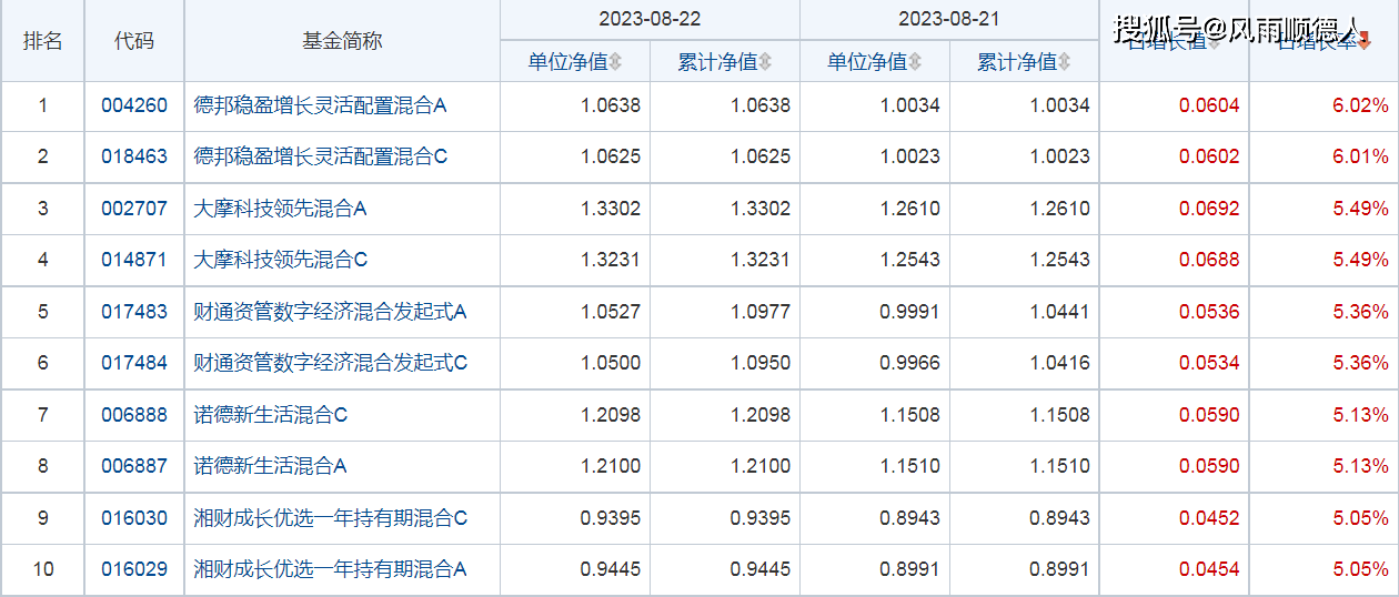 2023年8月22日开放式基金净值增长排名前10