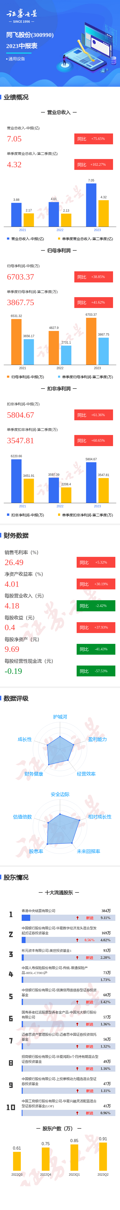 同飞股份2023中报显示,公司主营收入7.05亿元,同比上升75.65%;归母净利润6703.37万元,同比上升38.85%;扣非净利润5804.68万元,同比上升61.36%;其中2023年第二季度,公司单季度主营收入4.32亿元,同比上升102.27%;单季度归母净利润3867.76万元,同比上升41.62%;单季度扣非净利润3547.81万元,同比上升60.65%;负债率17.57%,投资收益641.71万元,财务费用-322.24万元,毛利率26.49%。